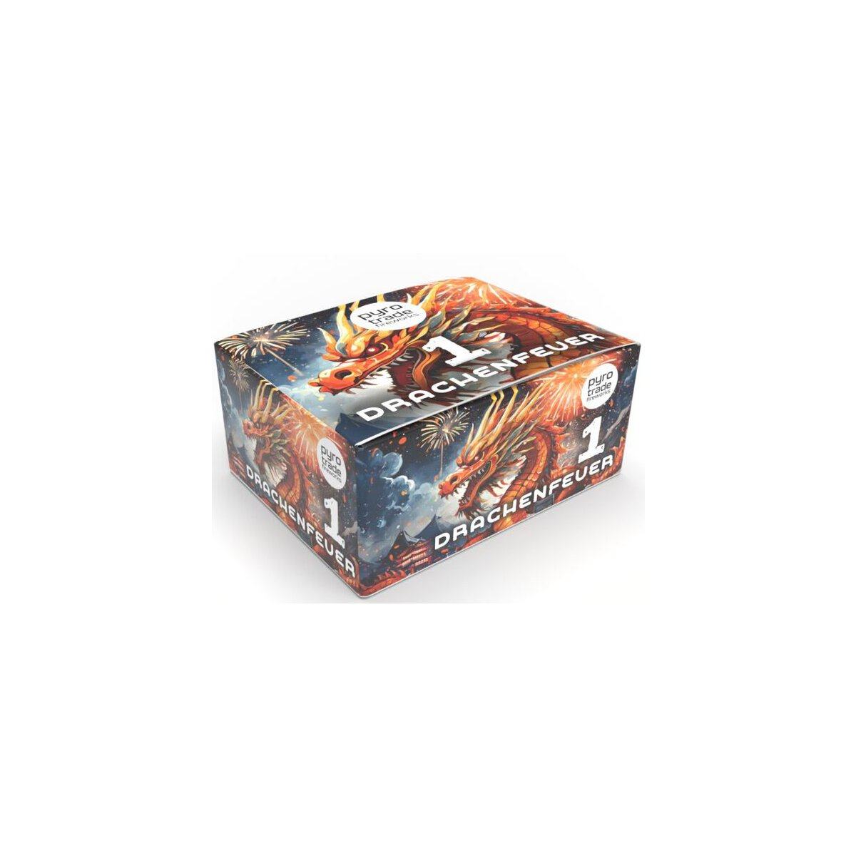 Im Wechsel gefächerte Leuchtspuraufstiege in rot und grün, zu goldenen und roten Brokat- und Blinkereffekten. Gerade geschossene Wirbelaufstiege zu üppigen feurigen Buketts mit Crackling Highlights.