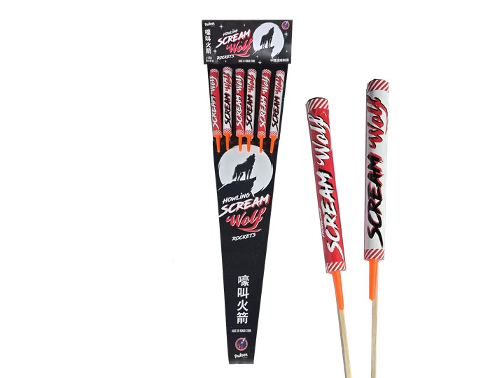 6 schrille Pfeifraketen mit Heul-Aufstieg zu Gold- und Silber-Palmen mit verschiedenfarbigen Blinkern und Cracker Sternen.