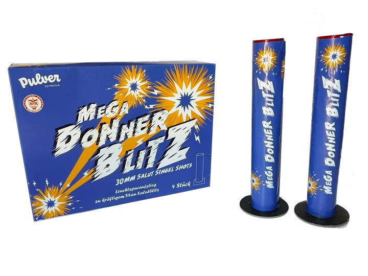 Der "Mega Donner Blitz" startet mit einem roten Leuchtspuraufstieg, der sich in den Himmel schraubt, und dann der ultimative Titan-Salutblitz: grell, laut, durchdringend. Ein Einzel-Effekt, der keinen Zweifel lässt – reiner Druck und Lichtblitz für maximalen Schalldruckpegel. Laut. Hell. Mega!